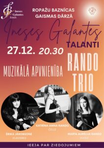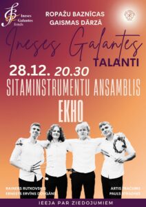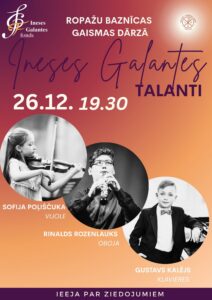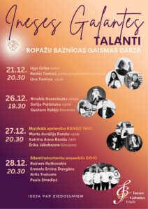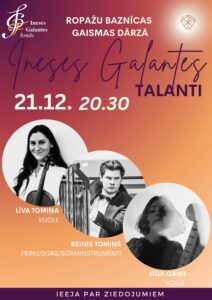21. decembrī plkst. 20:30, Ropažu Gaismas dārzā izskanēs pirmais Ineses Galantes Talantu Ziemassvētku koncerts – sirsnīgs vakars, kurā uzstāsies trīs izcili jaunie mūziķi, kuru izaugsmi ir veicinājusi Ineses Galantes Talantu programma: koklētāja Līga Griķe, vijolniece Līva Tomiņa un sitaminstrumentālists Reinis Tomiņš.